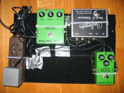 Den frei gewordenen Platz auf dem kleinen Brett nimmt jetzt der MEK Fuzz ein, somit kann ich Peter Plexi klassischerweise wahlweise mit dem TD1 oder dem Fuzz anblasen, und das Stimmgerät findet auch noch Platz (oben rechts). So sieht das aus: