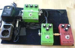 Nun ergab es sich ja, dass ich mir von meinem Mitgitarristen ein großartiges Petersburg - 50Watt Plexi Marshall Top (Peter Plexi) habe bauen lassen, das in Kombination mit dem Daniel D. auf dem kleinen Brett eigentlich schon zu durchschlagskräftig ist. Außerdem war ich mit meiner Zerrer Kombination auf dem großen Brett nicht mehr so richtig zufrieden. Was folgte war eine Experimentierphase, in der ich so ziemlich alle Kombinationen meiner Zerr - Trampelkisten (Vox Valvetone, Route 66, Rat2, MEK Fuzz, Okko Fuzz, Roger Mayer Mongoose) ausprobiert habe. Da ich immer schon neugierig auf einen Diabolo war, habe ich mir außerdem einen solchen mal zum Test geliehen (Danke Diet!). Und was soll ich sagen, in dem Moment als die LED des Diabolos zu leuchten begann, war die Entscheidung gefallen! Alles, was ich je darüber gelesen hatte, stimmt, und ich Depp frage mich, warum ich den erst jetzt mal getestet habe. Kurz und gut, zwei Tage nach diesem Test suchte im Grünen jemand einen Käufer für seinen Teufel und fand ihn ziemlich schnell :-)