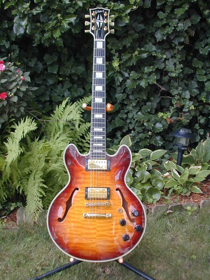 335s always felt too big to me, so when this model came alaong I fell in love. They are not easy to find (almost impossible in 2003) and I ended up buying this one over the phone without ever trying one. Man did I get lucky! The current CS-336 uses the same construction, but has a rosewood board, dot inlays and more plain styling. 356s like mine have ebony boards and LP Custom/ES-345 style inlays and binding, gold hardware. The back and sides are routed out of a solid, thick plank of mahogany leaving some center block area, then the maple top is glued on and then routed/carved like an LP. They only weigh a little over 7 lbs, and the overall body size is just a little larger than an LP -- much smaller than a 335, but not head-heavy at all.