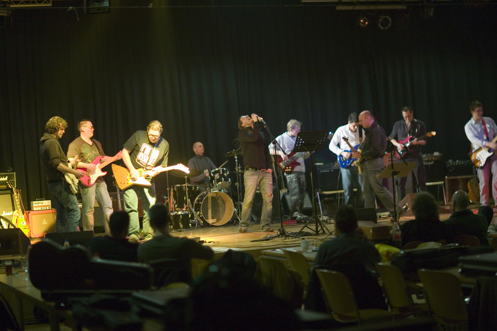 : an meinem Shirt sehe ich, daß das Foto vom Freitag ist, ich vermute, daß wir gerade beim Schlußinferno der Freitagsversion von Rockin' in the free world sind und da sind 3 gleichzeitige Solisten das amtlich vorgeschriebene Minimum. Jonas wird unsere Lücken mit spitzen Schreien gefüllt haben. : Also alles in Butter. :-)