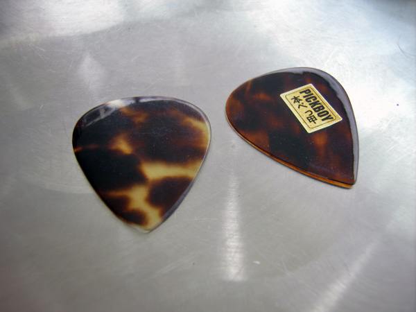 Nein, eigentlich nicht mehr als sonst auch, aber es ist das Pickboy Custom Old Fashioned Tortoise Shell und wer dem link gefolgt ist, der hat beim Preis vielleicht auch gezuckt. Es ist auch nicht nur der Preis, wobei der schon ziemlich heftig ist. Es ist auch so, daß ich zwei Stück besitze - die beiden auf dem Bild oben - und sie unterscheiden sich leicht. Jetzt kann man natürlich sagen, daß echte Schildpatt-Picks wohl auch nie identisch waren. Aber wenn man sich so ganz und gar auf ein Plec eingeschossen hat und das kommt unter die Räder, geht verloren oder kaputt - was dann? Das nächste (Ersatz-)Pick kann anders ausfallen.