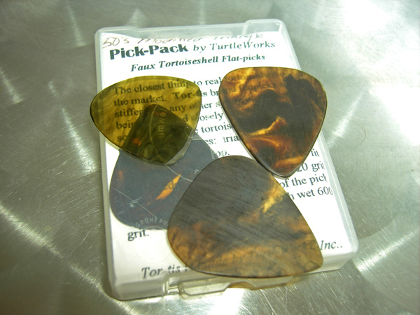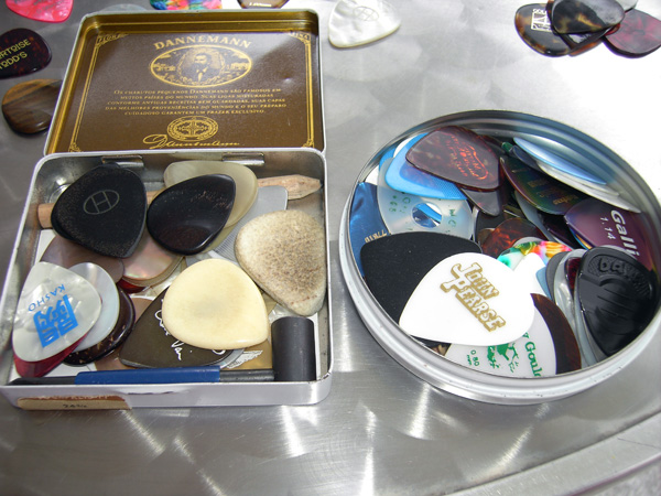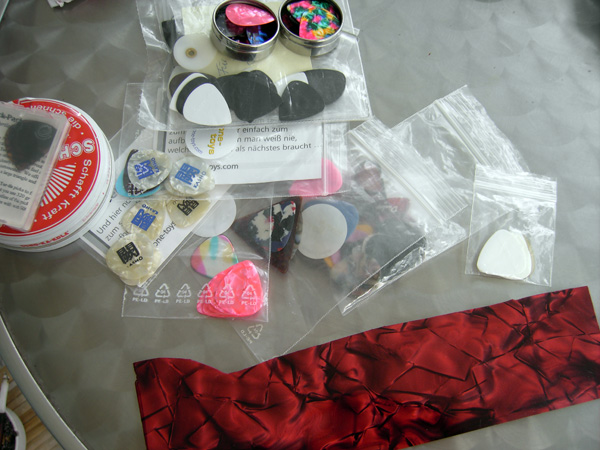 Da sind sogar noch die beiden Versionen der Bakersfield-Plektren zu sehen, das weiße ist ziemlich dünn und das schwarze ist noch dünner, aber die Dinger wurden mal ziemlich gelobt und da musste ich sie natürlich in meine Finger bekommen. 1999 war das und über das Archiv kann man sogar noch heute die verzweifelte Suche nach diesen Wunderplecs :-) nachlesen.