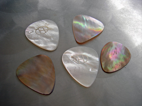 Auf der elektrischen Reso und besonders auch der Tricone spiele ich aber auch sehr gerne mit Plektren aus Perlmutt: