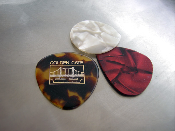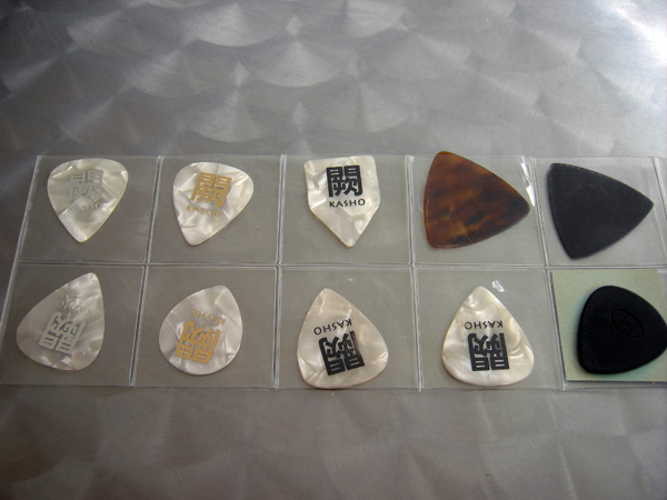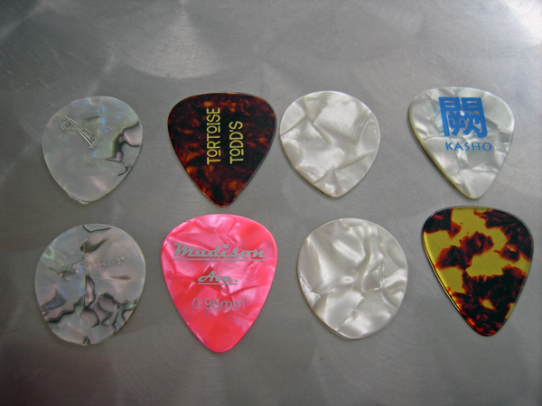 Danach spielte ich Fender Heavy oder Extra Heavy in Perlmuttoptik mit Custom Shop-Audruck, natürlich Normalform, aber ab dann auch ab und an die etwas kleinere Form (bei Kasho ist das die #3, aber Kasho kommt erst später). Die klangen gut und sahen auch noch gut aus.