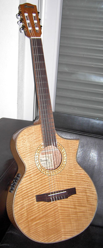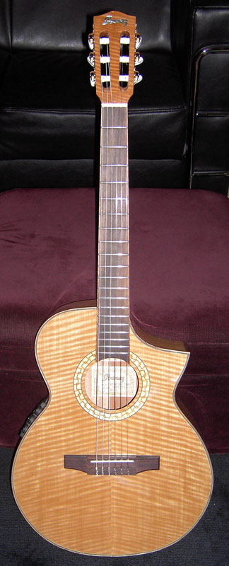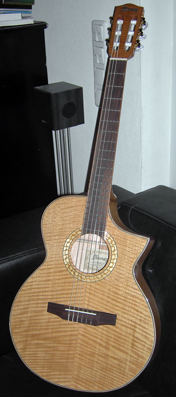 (Gitarre) Vernunft in natur ;-)Beitrag von Jochen vom November 05. 2008 um 02:16:10: Tachchen,ich habe heute auch zugeschlagen. Ich mag ja Gitarren mit Nylonsaiten sehr und würde sie auch gerne in der Unplugged-Band einsetzen, wollte aber meine spanische Schönheit nicht umrüsten. Außerdem klingt sie zwar famos, was aber doch leider mit jedem Tonabnehmersystem auf der Strecke bleibt - und wer kann schon sagen, welche Auswirkungen das dann auf den normalen Klang der Gitarre hat. Vor einem Mikro möchte ich auch nicht kleben müssen. Zudem spielt sie sich auch nicht wirklich von alleine und für den Wechsel zwischen Stahlseiten und Nylonsaiten während des Gigs sind die Unterschiede in der Bespielbarkeit doch schon ziemlich heftig. Nun gibt es von Ibanez eine Gitarre mit dem wunderschönen Namen EWN30SYENT. Das geht doch locker von der Zunge, oder? Diese Gitarre hat ein paar Besonderheiten, die sie von "normalen" Konzertgitarren unterscheidet: das Griffbrett ist nicht ganz so breit, der Radius nicht ganz soooo flach und der Hals-Korpusübergang ist am 14. Bund. Ansonsten fühlt sie sich aber schon eher wie eine Konzertgitarre an, der Korpus hat eigentlich gewohnte Ausmaße. Eigentlich dachte ich, daß ich sie bestellen, oder zumindest nach Köln fahren müsste (wobei ich nicht so gerne in diesen Laden gehe), rief dann aber heute einfach mal auf Verdacht bei einem Händler in Ratingen (bei dem ich schon seit 28 Jahren Kunde bin) an und siehe da, die Gitarre war grad frisch reingekommen. "Soll ich sie Dir zum Antesten reservieren?" - "Ja gerne, nächste Woche komme ich vorbei." "Nächste Woche" hahaha. Habe dann ein bisschen früher Feierabend gemacht, Konrad noch in den Wagen gepackt (der wollte gerne mit) und dann ab nach Ratingen. "Hängt im Akustikraum, ist ein Zettel dran." Getestet, gekauft und hier ist sie nun: ![]() ![]() ![]() Als Tonabnehmer ist ein B-Band UST eingebaut, der gefällt mir schon an meiner Stahlsaitengitarre sehr gut, das war mir also sehr recht und als Anschlüsse gibt es Klinke und XLR. Vielen Dank übrigens noch an Wolfgang, der mir viel von seinen Erfahrungen mit verschiedenen Nylon-Gitarren, die es hätten werden können, erzählt hat und damit geholfen hat ein paar Modelle schon früh aussortieren zu können. Viele Grüße Jochen