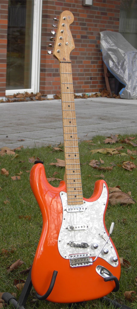 Jetzt überlege ich noch, ob ich mich zum einen von den chromfarbenen Pickuprahmen und den Domespeedknöpfen verabschieden soll und ob ich zum anderen das Pickguard gegen ein weißes (vielleicht sogar einlagig) tauschen soll.