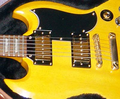 Die Gitarre ist sehr schwingungsfreudig, der Hals ein Gedicht. Sie ist unheimlich leicht, trotz der Bleischnur im Elektrofach. Ohne diese würde sie vielleicht sogar wegschweben. Die GFS-Pickups sind geil, sie klingen wie P90er, brummen aber so gut wie nicht. Hier besteht also kein Bedarf an Austausch. Und diese SG ist so vielseitig, daß ich auch einen ganzen Gig damit spielen könnte. Ich bin echt glücklich, daß sie sich jetzt für mich entschieden hat.