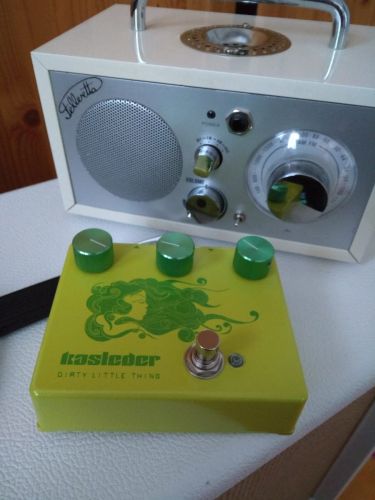 Das ist ein von Andreas Feller zum 6/3 Watt – Amp umgebauter Radiowecker, der stand lange in den Ebay Kleinanzeigen und musste dann irgendwann von mir gerettet werden:) Außerdem ein Kasleder Dirty Little Thing, ein Tubescreamer, der allein schon durch seine Farbgebung in dieser Zeit seine Daseinsberechtigung hat. Zusammen klingen die beiden so (Genudel…).