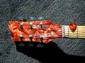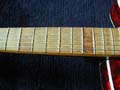 Was mir nicht sonderlich gefiel, waren hauptsächlich 3 Sachen: die Kopfplatte in ihrem dreckigen weiß, mit einem Rest des Griffbretts paßte so gar nicht zum Rest der Gitarre, die Mechaniken waren schludrig montierte alte Schaller mit kaputten Plastikgehäusen, die die Stimmung nicht hielten und der ursprüngliche Vorbesitzer, also nicht Matthias, hatte das Griffbrett bemalt, das sieht man hier ganz gut: