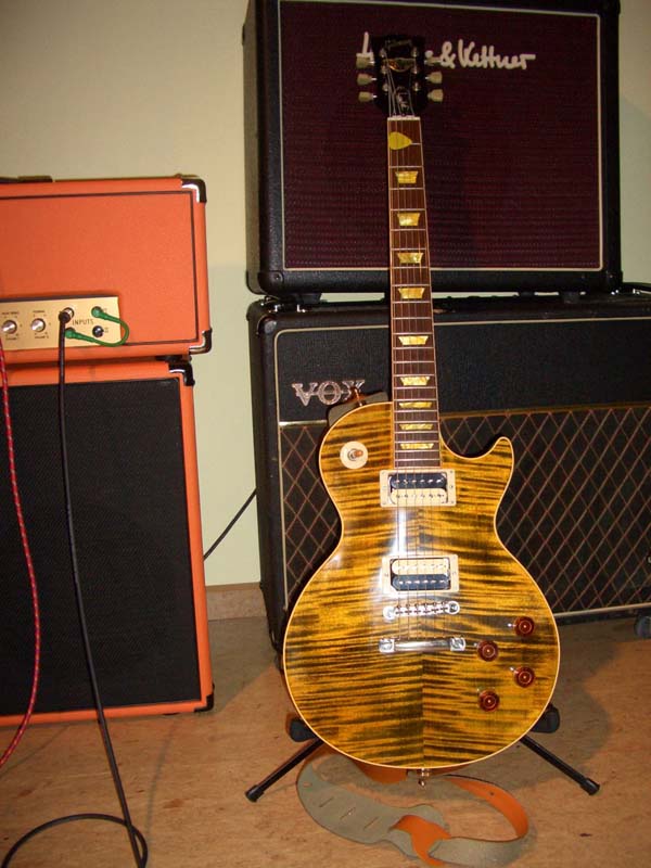 Gitarren waren die Explorer mit den Zhangs, Paula mit Seth Lovers und noch ne Paulakopie mit gewachsten Pickups. Ich bin ja eigentlich nicht der Freund von gewachsten PUs, aber meine Zhangbucker sind auch gewachst, allerdings nur einmal. David wachst sie ja normalerweise noch ein zweites mal, wenn die Kappen montiert sind, ist bei diesem Pärchen aber nicht so, ansonsten bin ich bei David über meinen Schatten gesprungen und habe die PUs gewachst genommen, habe ihm da vertraut, habe es auch nicht bereut.