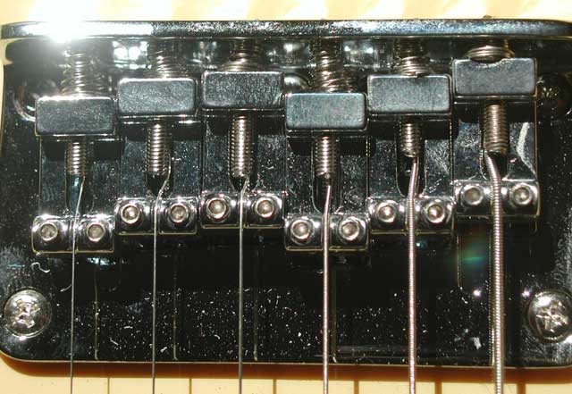 Man sieht an der dicken E-Saite, aber auch bei der H-Saite ganz deutlich, daß die Saiten mit den hervorstehenden Enden der Schrauben in Platz-Konkurrenz stehen. Es ist ja keine String-through-Body-Konstruktion, sondern die Ballends ruhen hinten im Steg unterhalb der Schraubenköpfe. Das ist somit auch eine prima Sollbruchstelle fürSaitenrisse.